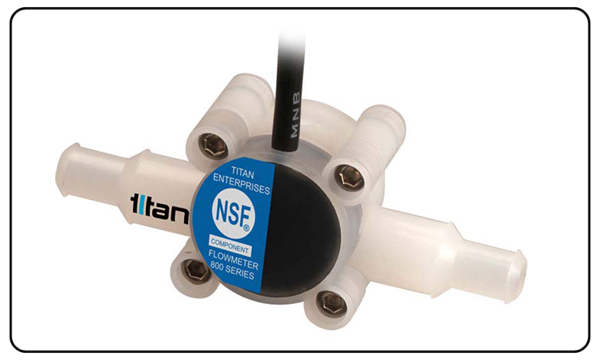 The 800 series flowmeter is designed to give high performance and competitive pricing with 6 flow ranges from 0.05 to 15 L/min. Its totally non-metallic wetted components makes this the ideal choice for the metering of aggressive chemicals including ultra-pure water. Titan Enterprises maintains certification under NSF169 for their 800 Series turbine flowmeters and beverage dispensing flowmeters, as ‘equipment for food and drinks products’. The bearings are made of sapphire for long life and reliability, the body is moulded PVDF as standard and the ‘O’ ring seal is typically Viton™.